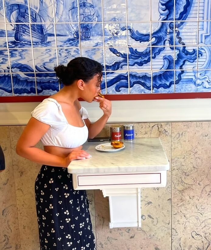 Begin your day at Praça Luís de Camões, a lively square in the heart of Lisbon. We took an Uber here from our hotel and walked towards Santa Maria Maior and Augusta Street. Augusta Street located in the vibrant Baixa district, is a shopper’s paradise, featuring a wide range of name-brand stores, boutiques, souvenir shops as well as restaurants and pastry shops. Here I found a cute one called 📍 Fabrica de Nata I satisfied my sweet tooth and got to capture my ideal Portuguese mood-board shots.