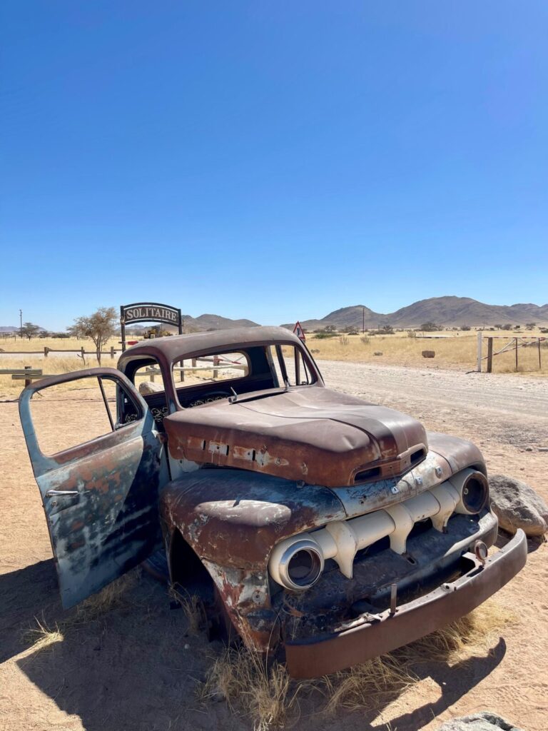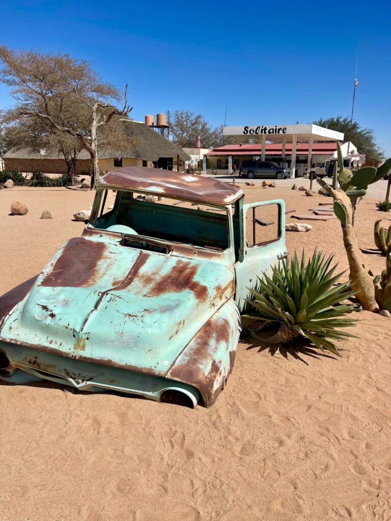 Halfway to the coast, Solitaire appears like a mirage in the desert. A tiny desert outpost famous for its apple pie, it’s a perfect quirky stop to stretch your legs. Rusted vintage cars dot the sand, giving it that wild-west-in-Africa vibe.