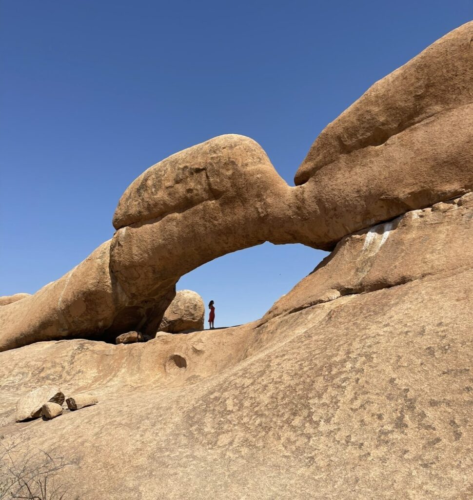 Leaving the coast, I drove inland to Spitzkoppe, Namibia’s “Matterhorn.” These dramatic granite peaks rise from the desert floor, dotted with natural arches and ancient rock art. The landscape feels raw, spiritual, and otherworldly — a must-see for any Namibia road trip.